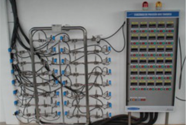 Equipamento eletrônico/analógico para controle de pressão de N2 e outros gases inertes em tanques de sucos integrais e naturais sem conservantes, com alarmes de sobrepressão (eventual fermentação), discador, descarga via solenóide automática e pressão de trabalho, bem como leitura analógica de todas as informações.